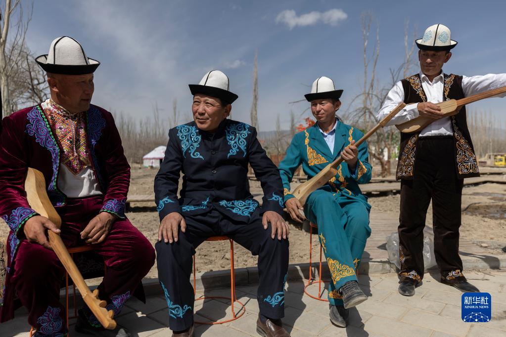 4月10日,在别迭里村,阿不都别克(左二)在等待上场时与民间艺人交谈。