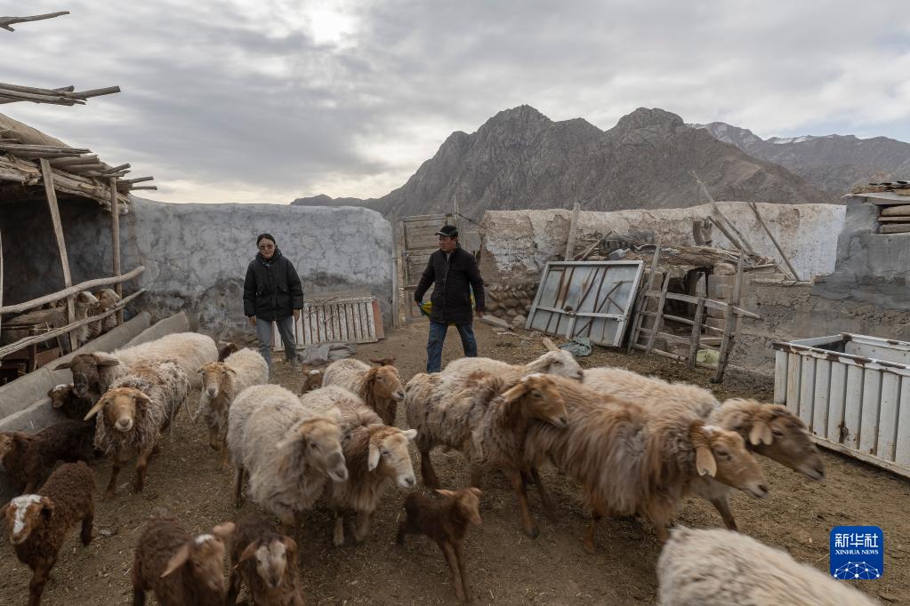 4月10日清晨,在阿合奇村,阿不都别克(右)和女儿一起把羊赶进羊圈。