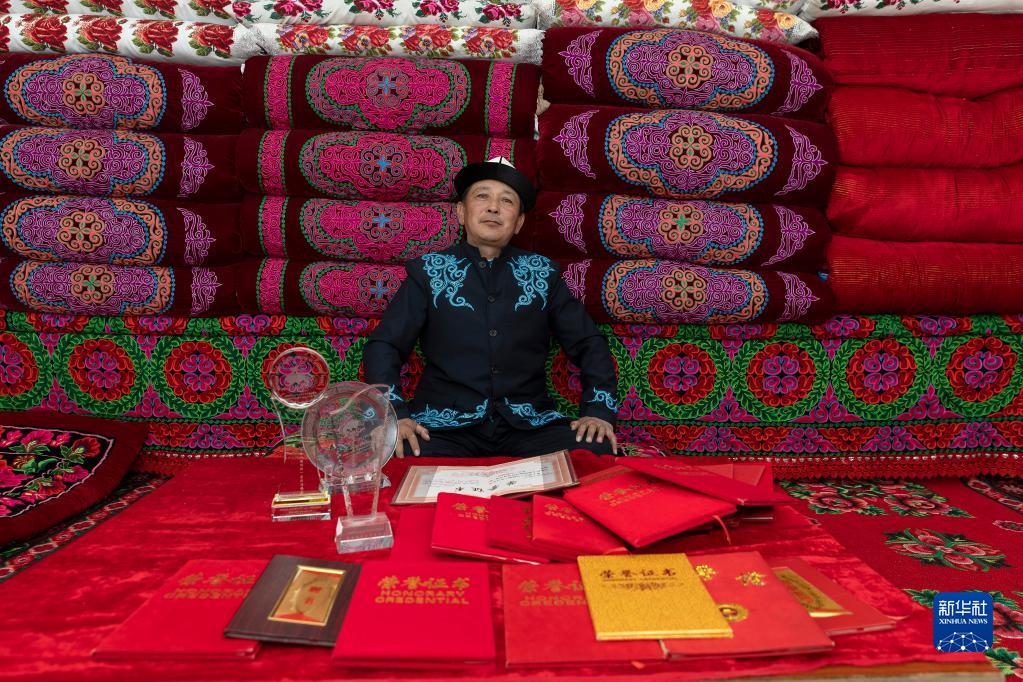 4月10日,在阿合奇村,阿不都别克展示自己获得的《玛纳斯》演唱比赛获奖证书和奖杯。
