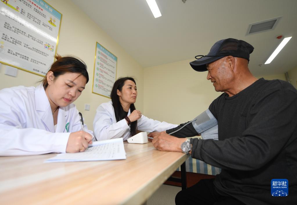 河北雄安新区容西第一养老驿站工作人员为老人测量血压(4月10日摄)。