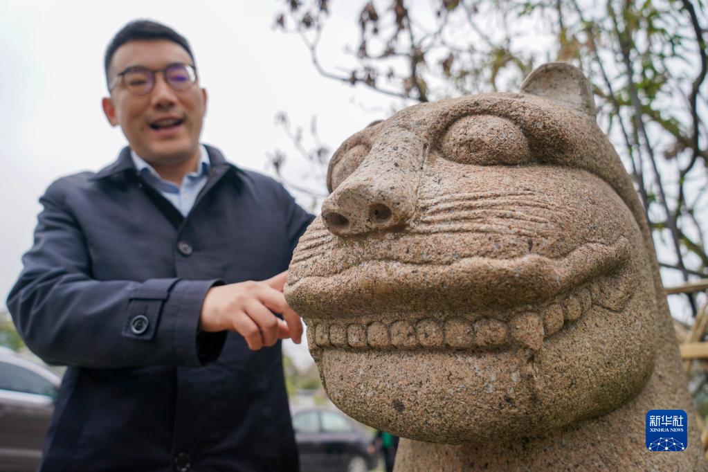 4月6日,彭锐在介绍文创产品“树山守”。 新华社记者 李博 摄