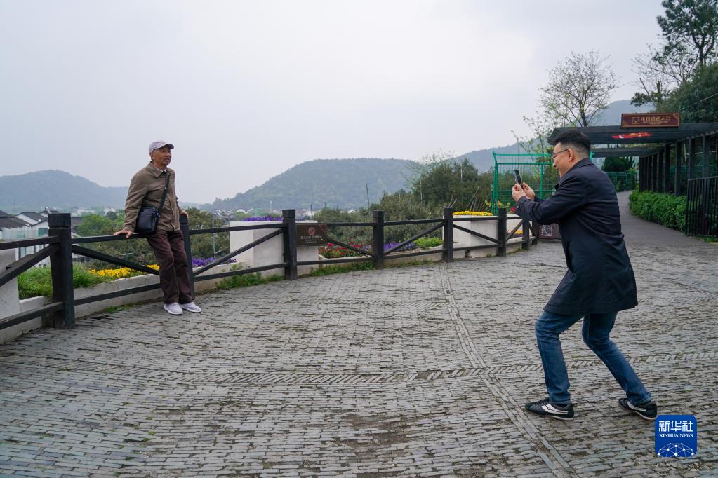 4月6日,彭锐(右)在树山村观景平台为一位游客拍照留念。 新华社记者 李博 摄