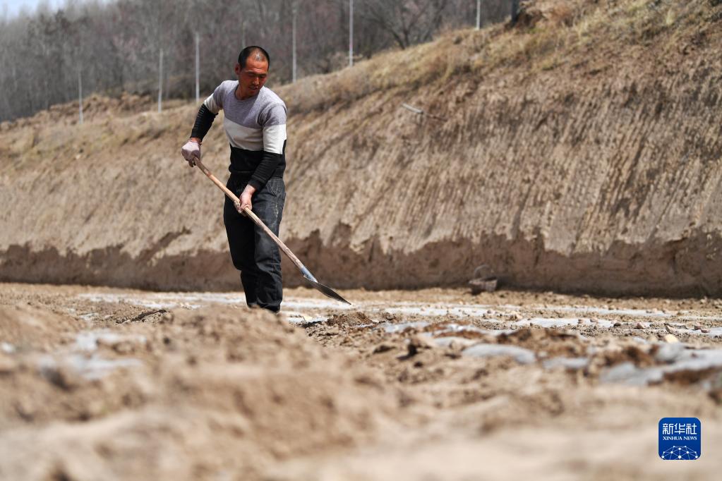 4月11日,在静宁县红寺镇胡沟村,一名村民在高标准农田里劳作。