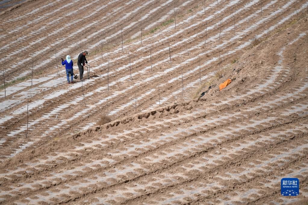 4月11日,在静宁县红寺镇胡沟村,村民在高标准农田里劳作。