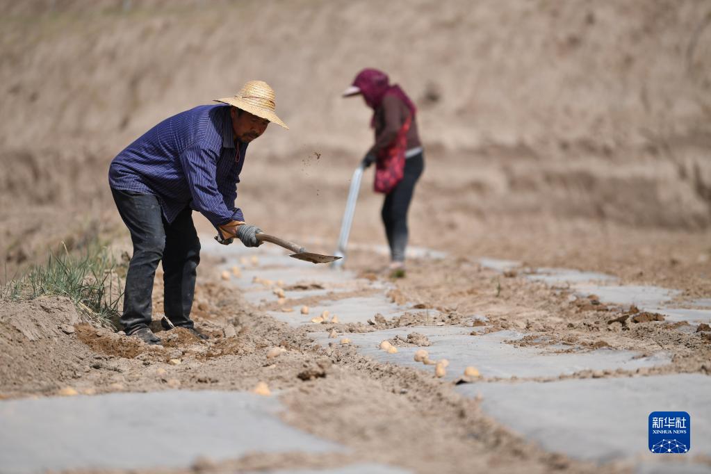 4月11日,在静宁县红寺镇胡沟村,村民在高标准农田里劳作。