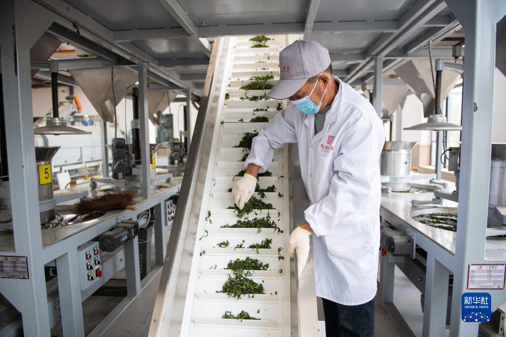 4月11日,在长沙望城乌山贡茶基地,工人抽查茶叶品质。