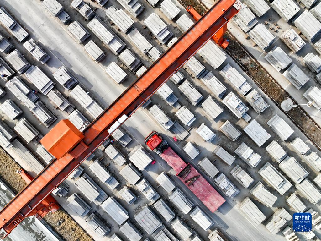 4月11日,卡车在河北省玉田县一家装配式建筑制造企业产品存放区内准备运输产品(无人机照片)。