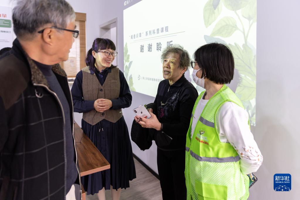4月11日在闸北公园市民园艺中心拍摄的“园艺课堂”。市民在听完公益讲师申瑞雪(左二)的课后,分享平时种植遇到的问题并寻求指导。