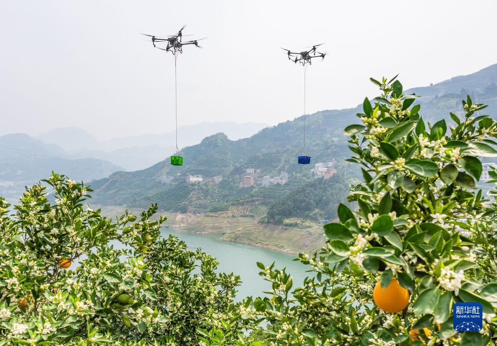 4月11日,秭归县郭家坝镇擂鼓台村村民在田间使用无人机转运刚收获的脐橙。
