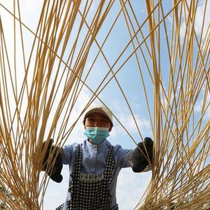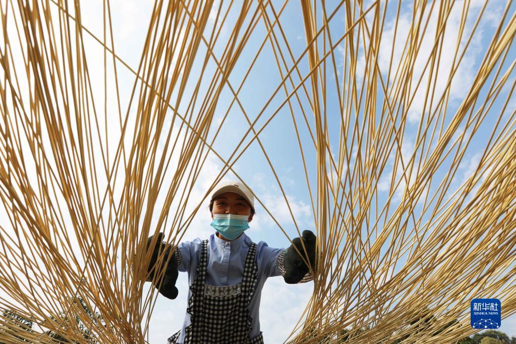 4月11日,在赤水市复兴镇太和村,工人分选竹丝。
