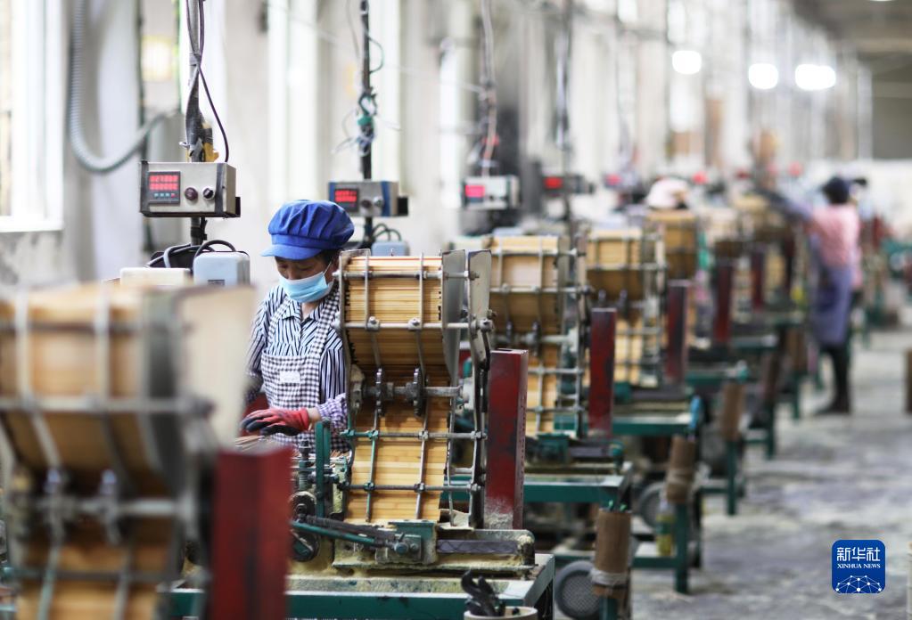 4月11日,在赤水市一家竹制品企业,工人在流水线上作业。