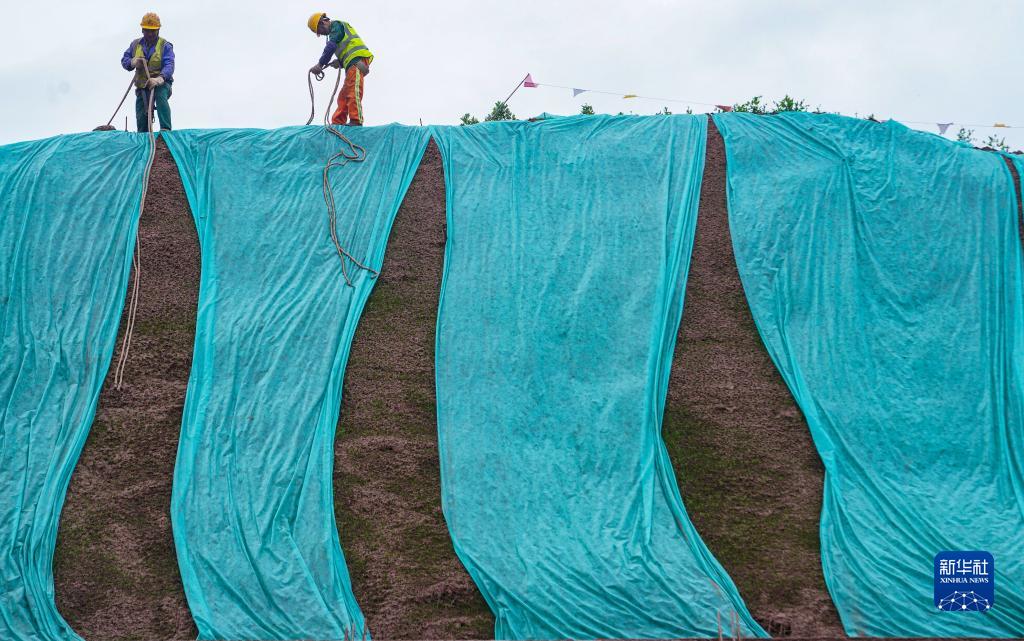 梁开高速梁平段筑路工人在整理路段边坡无纺布(2023年3月21日摄)。