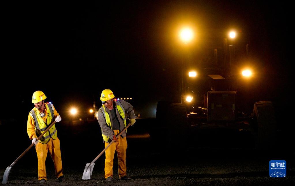 梁开高速梁平段筑路工人在铺筑竹海互通水稳层(2023年3月21日摄)。