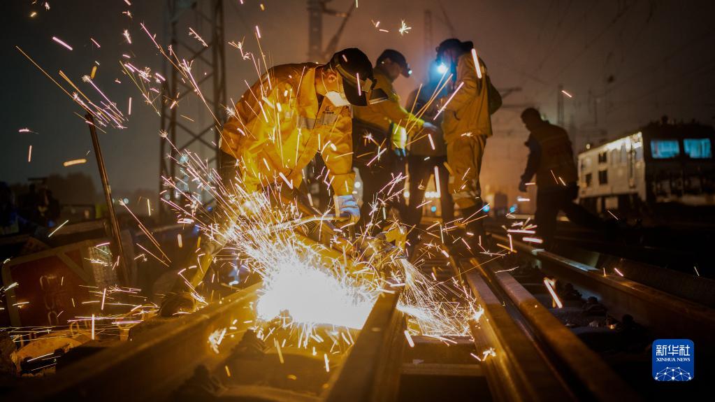 4月12日,在广西钦州港站,工人在切割旧轨换新轨。