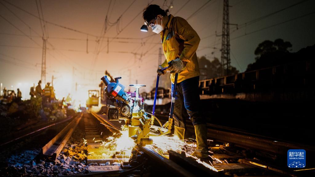 4月12日,在广西钦州港站,工人在打磨新铁轨。