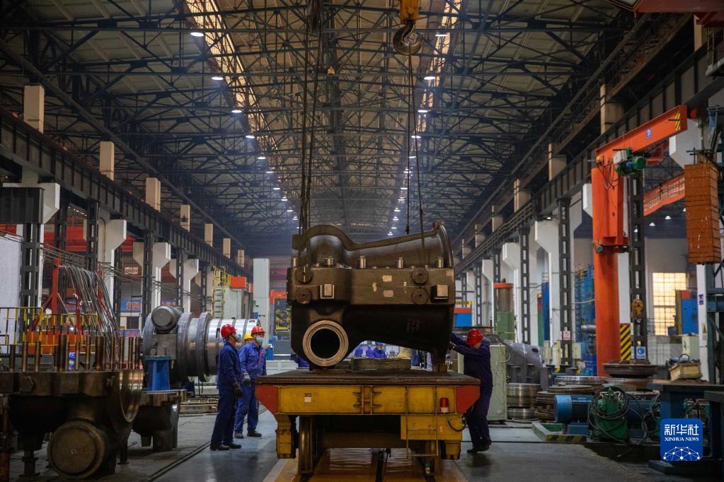 4月10日,工人在哈电集团哈尔滨汽轮机厂有限责任公司生产车间内进行作业。
