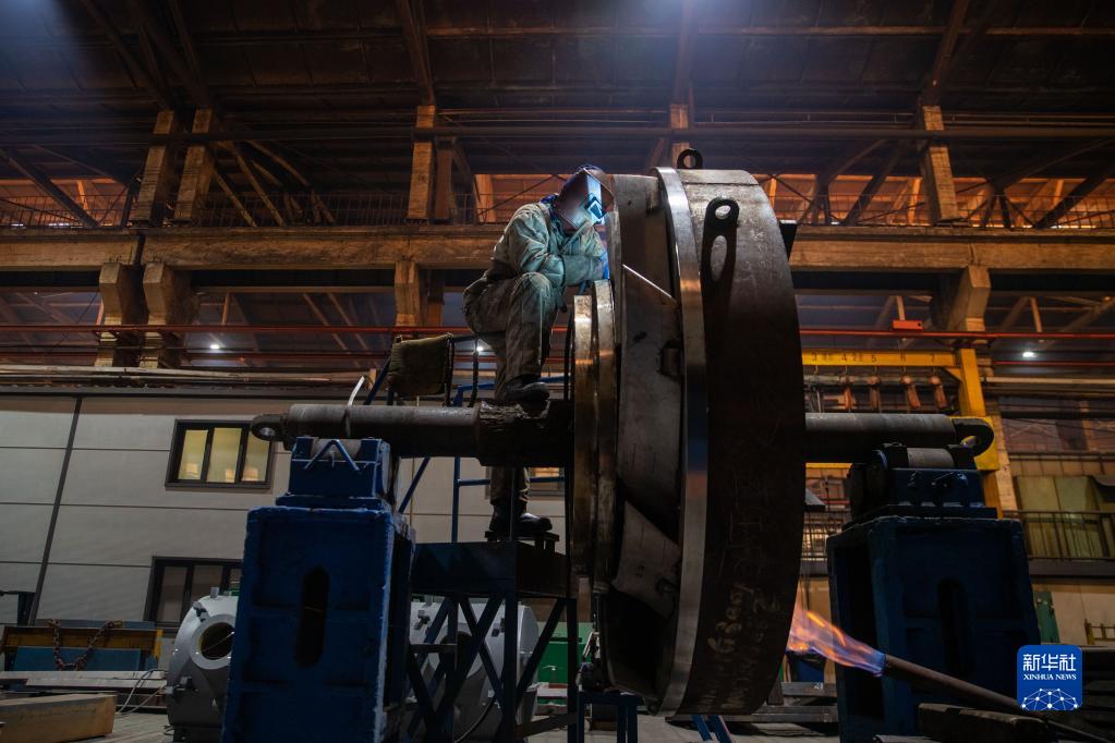 4月11日,工人在哈电集团哈尔滨电机厂有限责任公司生产车间内进行作业。