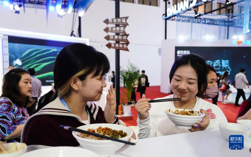 4月10日,参观者在消博会现场品尝南昌拌粉。