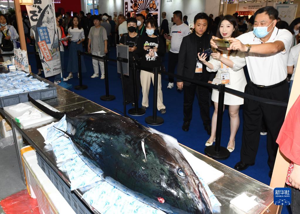 4月12日,观众在消博会拍摄展出的金枪鱼。