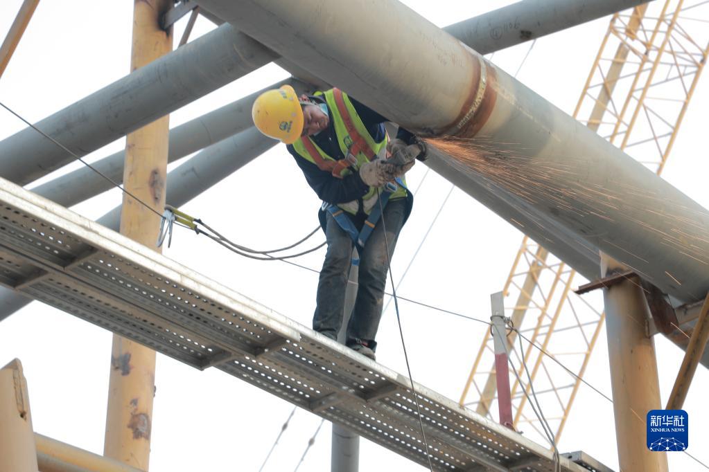 4月12日,工人在南昌东站站房工程现场施工。