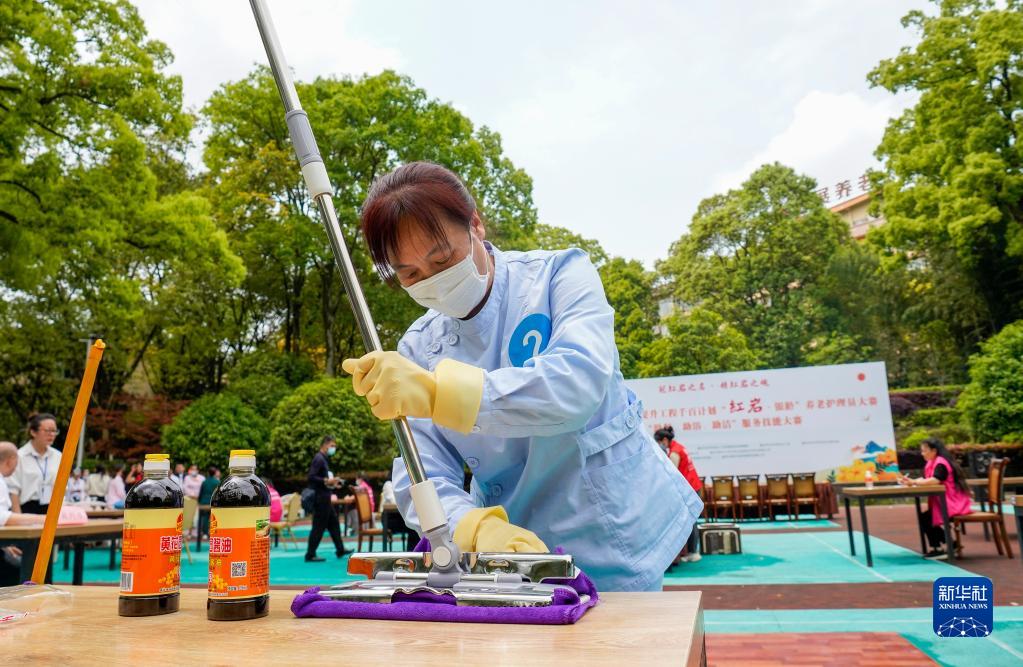 4月12日,一名参赛的养老护理员在进行养老环境保洁项目的技能比赛。