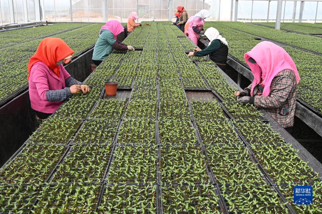 在张掖市甘州区党寨镇陈寨村玻璃智能温室内,农民们进行间苗作业(4月10日摄)。