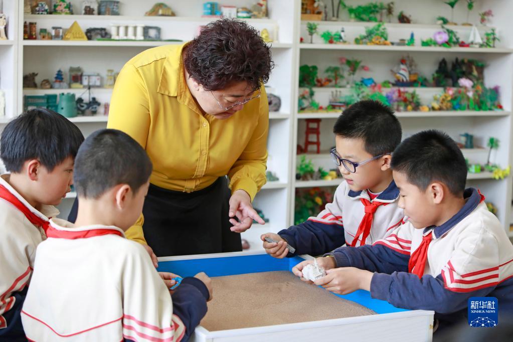 4月12日,大连市西岗区工人村小学的心理教师在心理辅导室陪学生一起摆放沙盘。