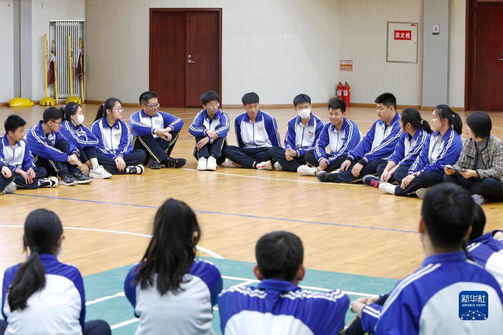 4月12日,大连市第十一中学的心理教师在体育馆给学生上心理团体辅导课。