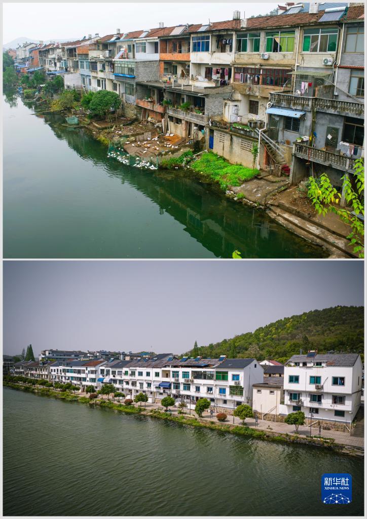 拼版照片:上图为诸暨市暨南街道街亭村开化江畔的民居(2013年11月13日摄);下图为村容村貌提升后暨南街道街亭村开化江畔民居新貌(无人机照片,2023年4月12日摄)。
