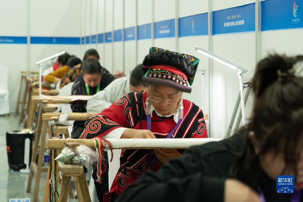 4月12日,在四川省绵阳市公共实训基地,参加刺绣项目的选手正在比赛中。