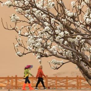 近日,甘肃省敦煌市鸣沙山月牙泉景区内的桃花、梨花、丁香花竞相绽放,别有一番韵味。