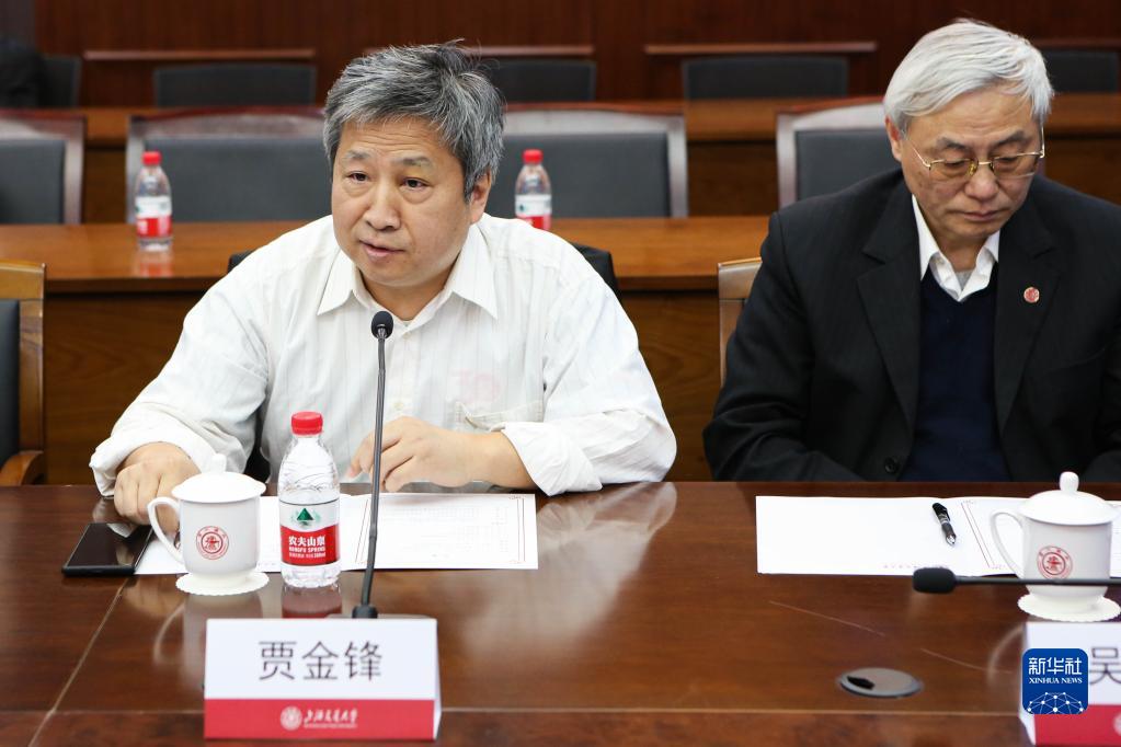 4月12日,中国科学院院士、上海交通大学物理与天文学院教授贾金锋(左一)介绍“实验证实超导态‘分段费米面’”成果整体情况。