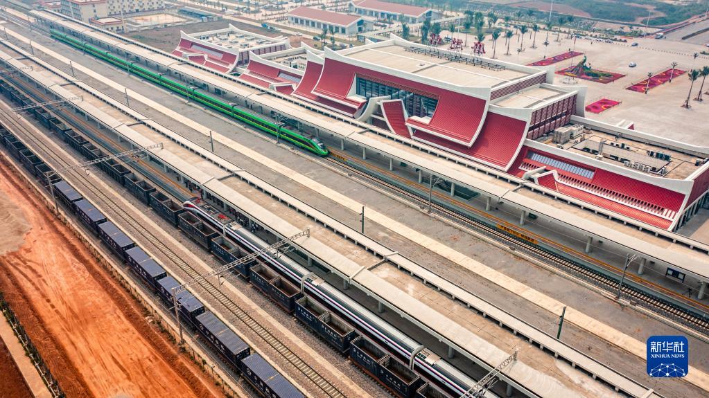 4月13日,“复兴号”(左上)、“澜沧号”动车组列车(中)停靠在中老铁路磨憨站(无人机照片)。
