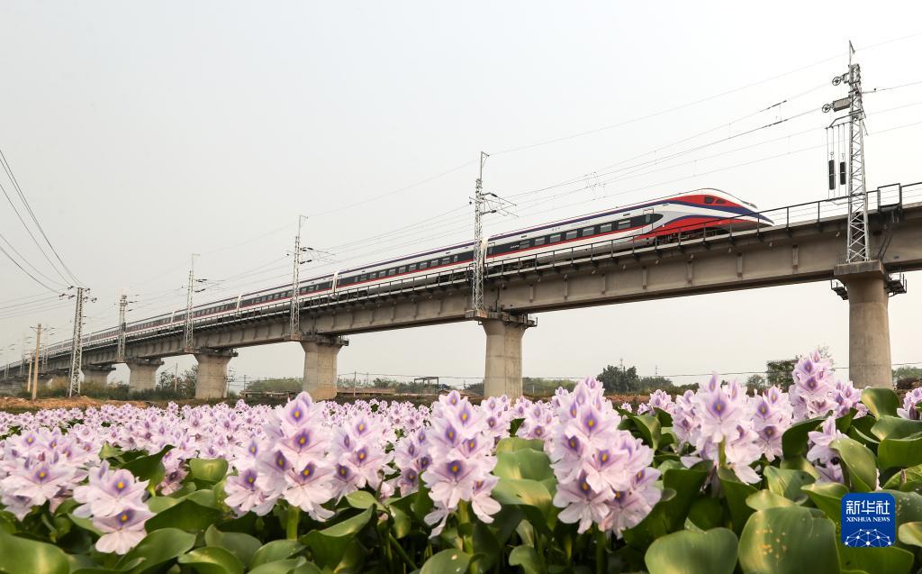 4月13日,从老挝万象站驶出的D888次“澜沧号”列车行驶在云南省西双版纳州境内的中老铁路橄榄坝特大桥上。