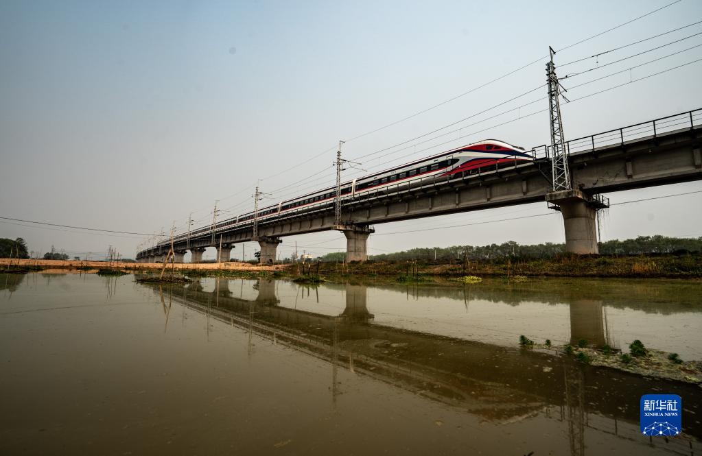 4月13日,从老挝万象站驶出的D888次“澜沧号”列车行驶在云南省西双版纳州境内的中老铁路橄榄坝特大桥上。