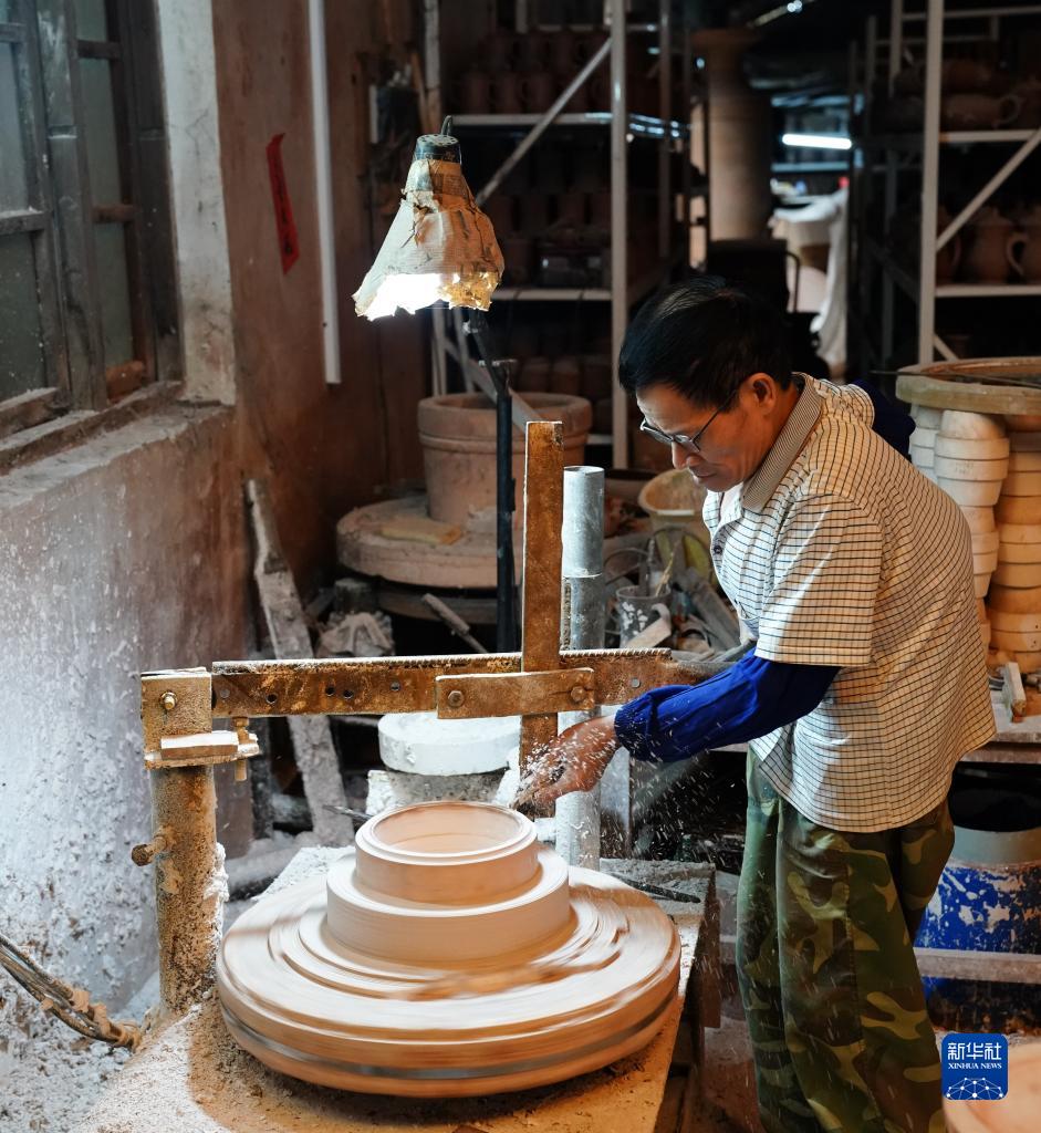4月12日,在广西钦州市,员工在坭兴陶生产车间制作模具。