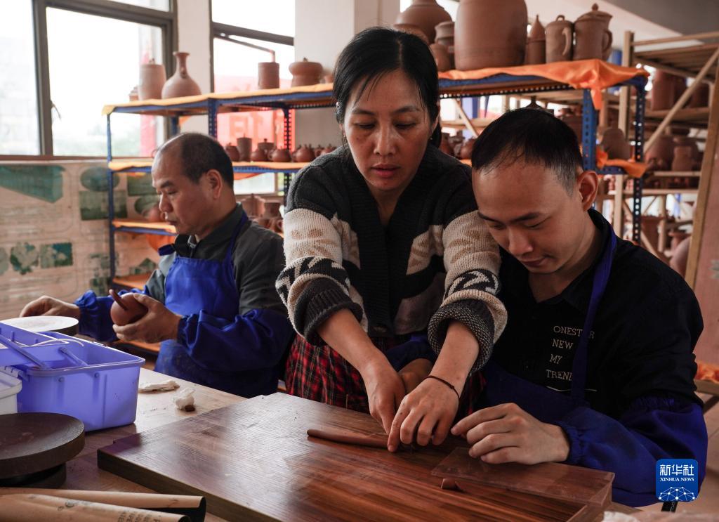 4月12日,在广西钦州市,员工在坭兴陶生产车间工作。
