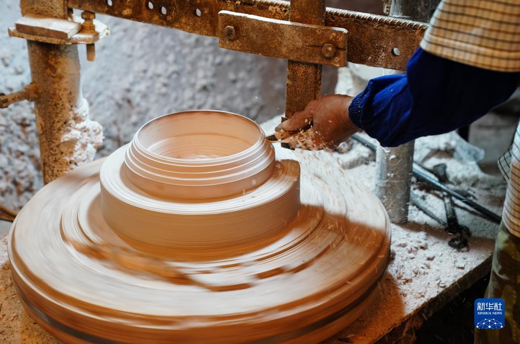 4月12日,在广西钦州市,员工在坭兴陶生产车间制作模具。