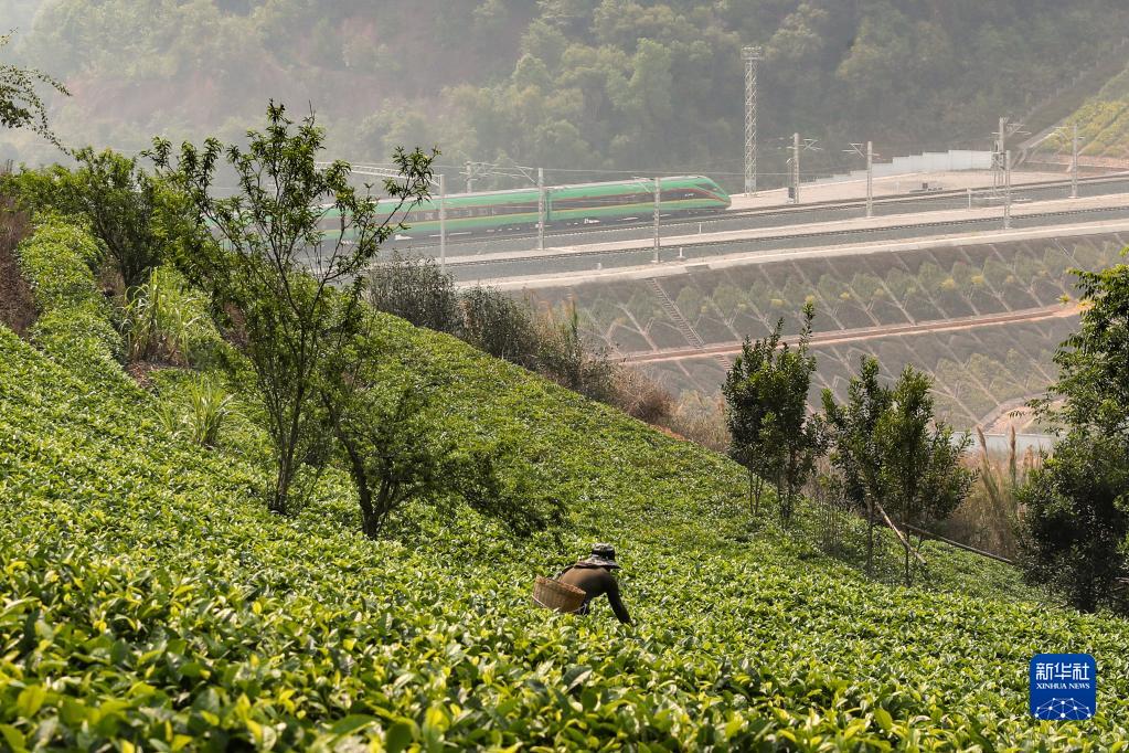 4月13日,“复兴号”列车驶过云南省普洱市的一座茶山。