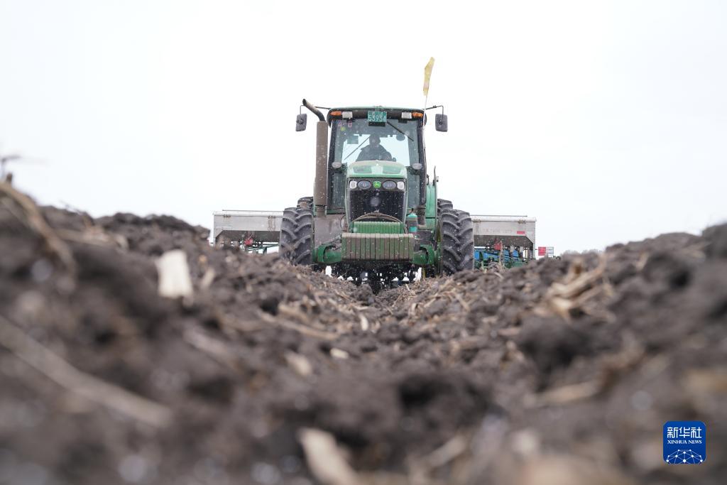 4月12日,在建设农场有限公司一处农田中,许志国驾驶大型拖拉机进行分层定量施肥作业。