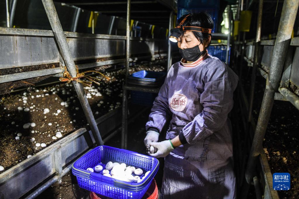 近日,在山东省泰安市岱岳区祝阳镇徐家汶村永乐食用菌科技产业园内,双孢菇进入采摘期,员工们在出菇房里采摘、分拣、装篮。目前,园区食用菌种植面积已达300余亩,年产食用菌4000多吨,为100多名村民提供务工增收的渠道。