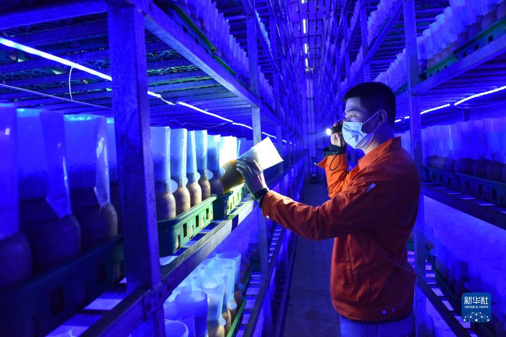 4月13日,河北省临西县一家食用菌生产企业的员工在菌菇培育车间查看金针菇的生长情况。
