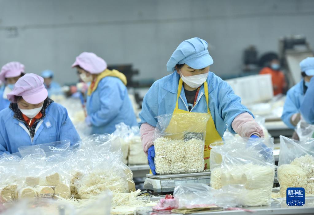 4月13日,河北省临西县一家食用菌生产企业的员工在包装车间分拣金针菇。
