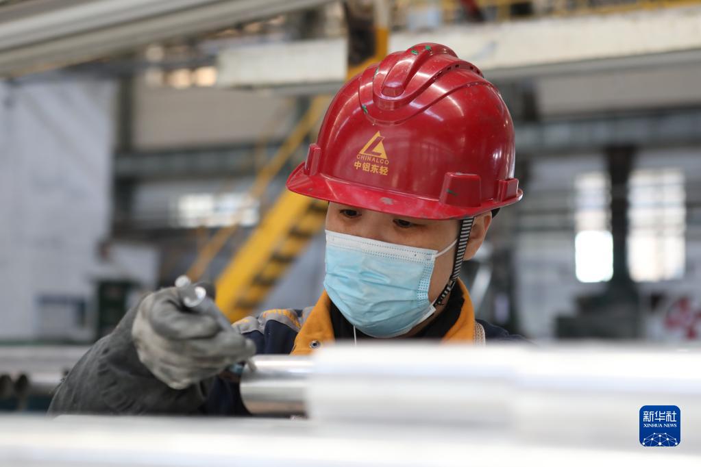 4月13日,在中铝集团东北轻合金有限责任公司,工人在生产厂区作业。