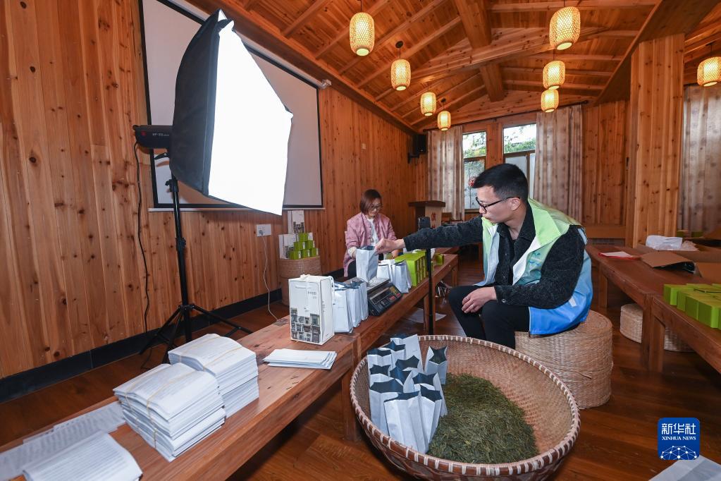 4月13日,在诸暨市东白湖镇斯宅村“裕昌号恒诺甄选共富工坊”内,志愿者(右)对斯宅石笕茶进行装袋称重。