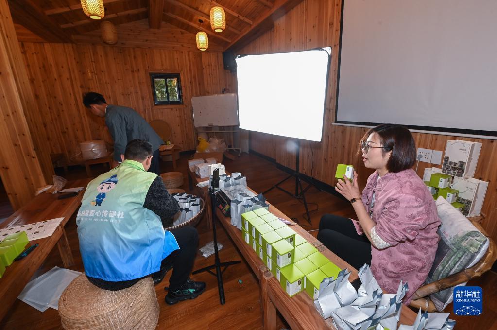 4月13日,在诸暨市东白湖镇斯宅村“裕昌号恒诺甄选共富工坊”内,志愿者(右一)在直播介绍斯宅石笕茶。