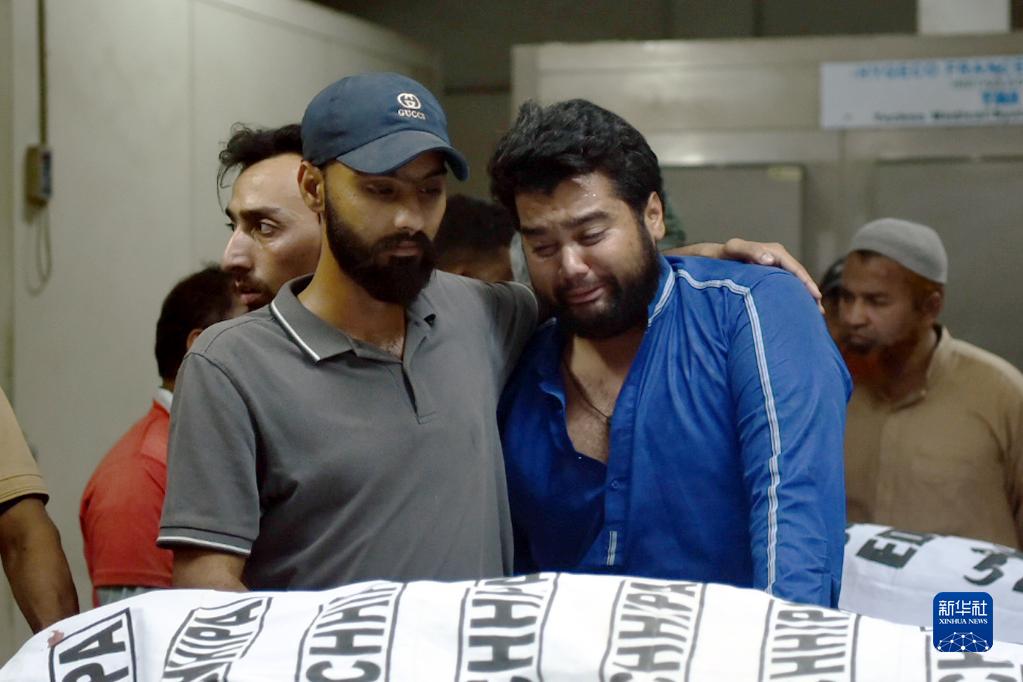 4月13日,在巴基斯坦卡拉奇一家医院,火灾事故遇难者家属悲痛不已。