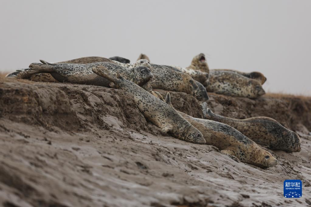 4月13日,西太平洋斑海豹在辽宁盘锦三道沟海域的滩涂上休息。