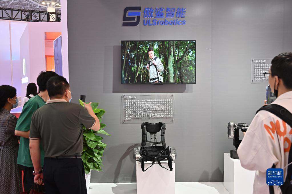 4月13日,参观者在上海展台了解一款腰部外骨骼机器人产品。