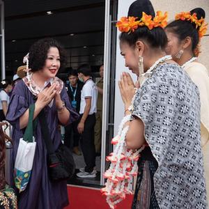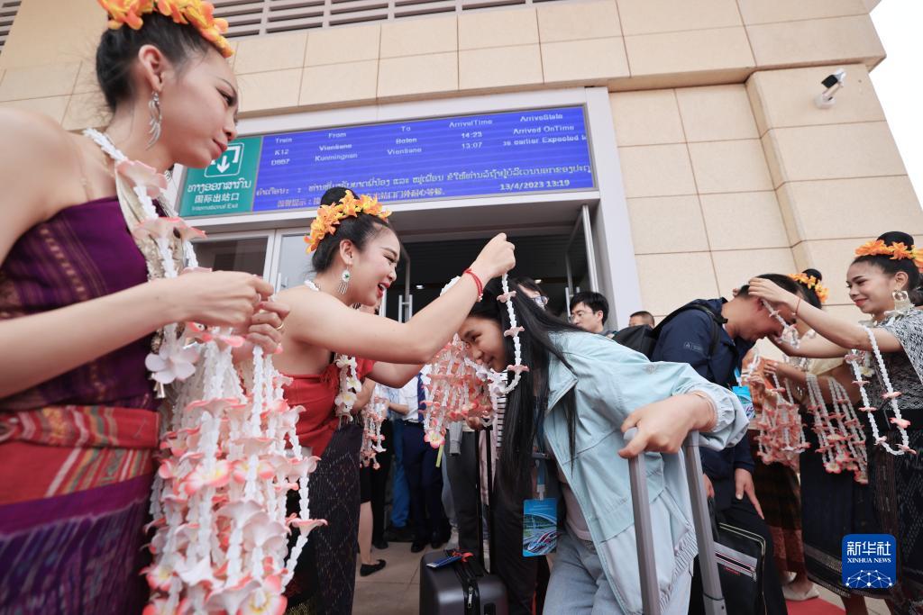 4月13日,在中老铁路老挝磨丁站,工作人员欢迎乘坐D887次国际旅客列车的旅客抵达磨丁。